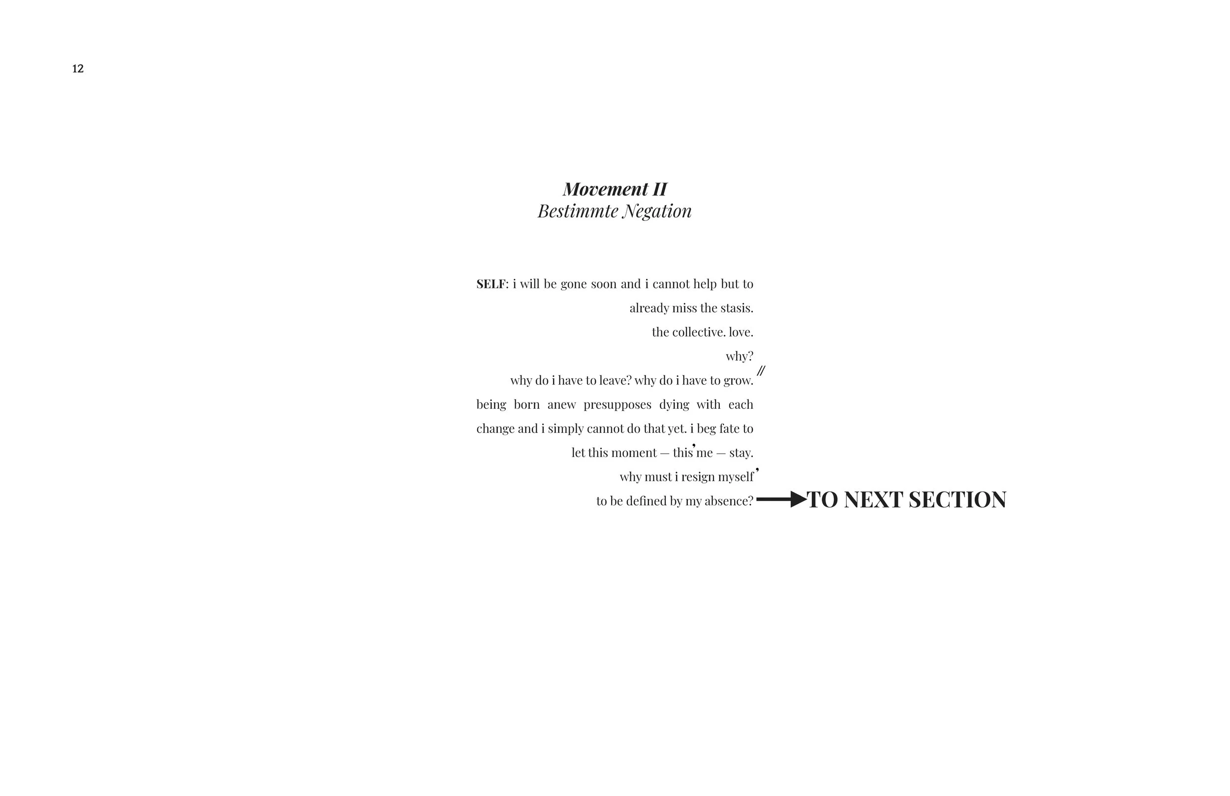 this piece was written to satisfy a (both academic and personal) requirement in my senior percussion recital at the University of Central Florida. it was written during a time where i was facing my final semester of my Bachelors and witnessing a metamorphosis of self; this was, incidentally, also a time where i was at an intersection of philosophies. i had picked up a knack for Hegel, as well as the films of Francois Truffaut, Jacques Tati, and Jean-Luc Godard, but i had also began reading the words of the Buddha. this resulted in an ablation of my “self,” as i saw it. if had earlier presumed that the self does not exist, this presumption was validated by the dialectical theory i had consumed. i reconciled the lack of a self with the unity of community, this piece being an extant listing of my findings, in a self-aware hybrid play/musical performance format.